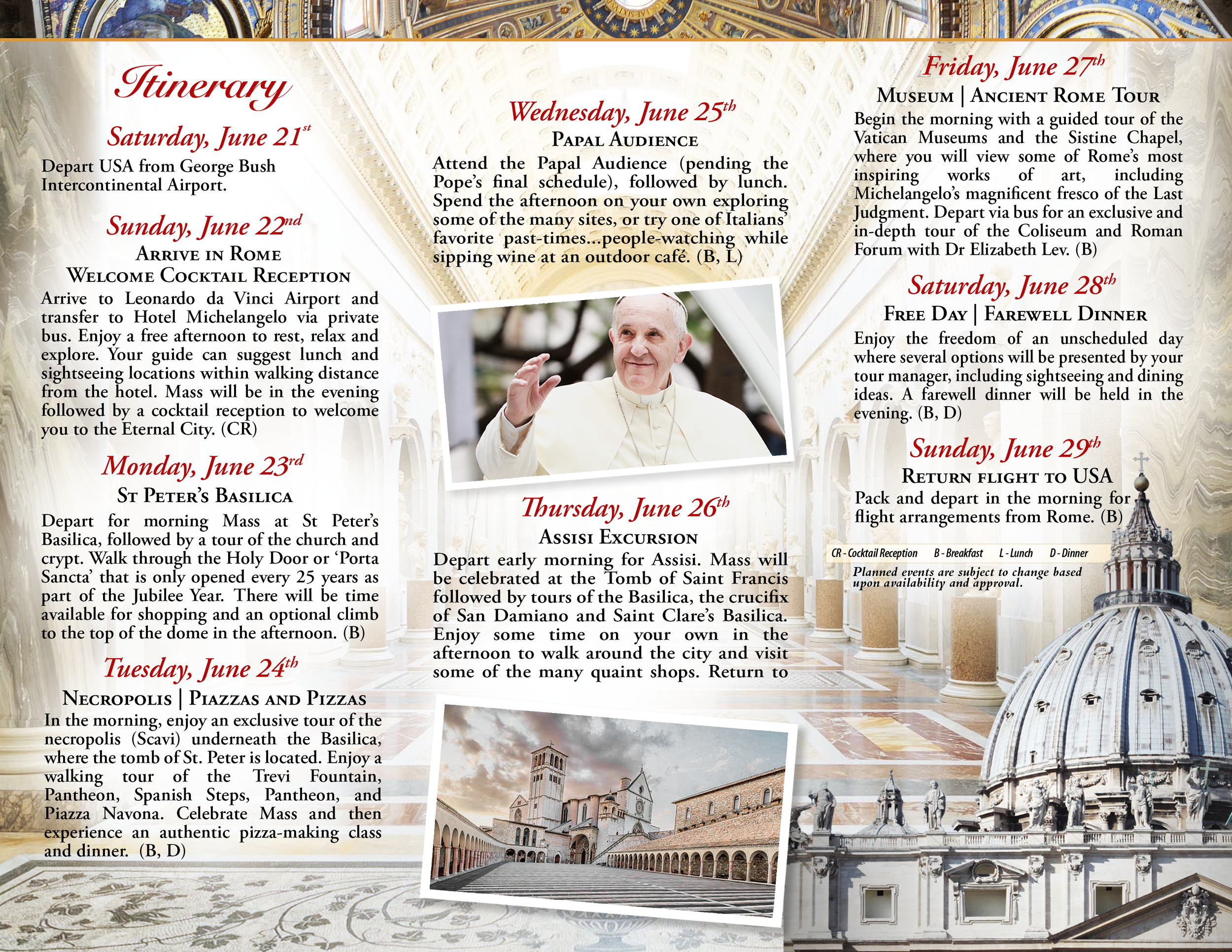 Arrive at Leonardo da Vinci Airport in the morning and transfer to lodging via coach bus. Once rested, enjoy a climb to the top of St Peter’s copula (dome) where the perfect cappuccino and beautiful landscape of Rome await you. Continue your immersion in this new country through a leisure walking tour that will help you get settled into your new surroundings prior to Mass. Conclude the day with a delicious dinner, welcoming you to the Eternal City. (D)